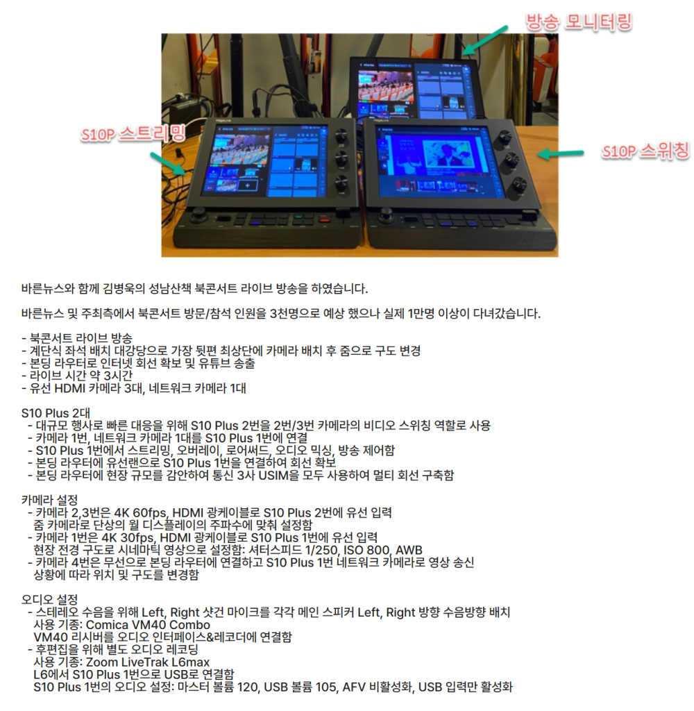 - 대규모 행사로 빠른 대응을 위해 S10 Plus 2번을 2번/3번 카메라의 비디오 스위칭 역할로 사용