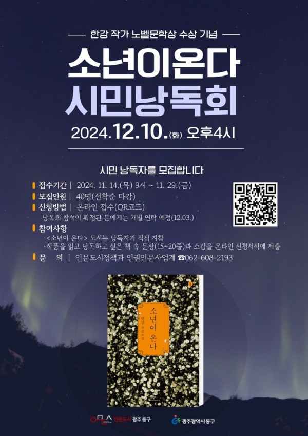한강 작가의 노벨문학상 수상을 기념하기 위한 낭독회가 내달 10일 동구 인문학당에서 열린다.